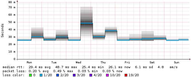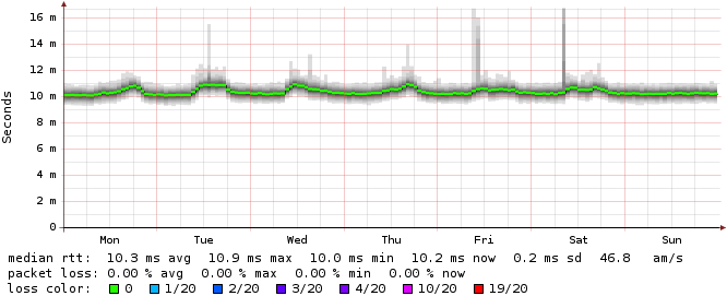 Spammo la lista con un paio di grafici da smokeping. Purtroppo nel caso di Alice sono dati vecchi, e quindi l'RRD ha piallato parecchio la risoluzione (come noterete siamo a 2 sample / giorno), il che tende a smussare via i picchi di schifezzume della Alice, ma su quelli fidatevi di me che c'erano. Salta comunque all'occhio, oltre al doppio netto (se non poco di più) di latenza su Alice, anche la variabilità della stessa, potete leggere la deviazione standard nei numeretti o valutare ad occhio il 'fumo' (ricordatevi che i grafici hanno scale ben diverse sulle ordinate!).